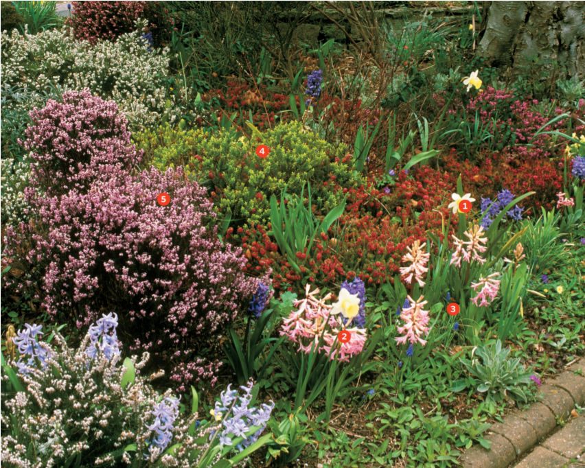 Assim, debaixo de uma faia gigante temos uma colecção de urze, enormes Erica arborescens, médios E. carnea e pequenos Calluna vulgaris, de cores diferentes, plantados na zona traseira e lateral do cantinho. Mais à frente a formação de cor é conseguida pelos jacintos (Hyacinthus orientalis), muscaris (Muscari armeniacum) e narcisos (Nascissus hybridus). No tapete verde da primeira fila as vincas (Vinca major e Vinca minor). Ainda nos demos ao luxo de encher o maciço com o verde das verónicas anãs (Hebe buxifolia).
