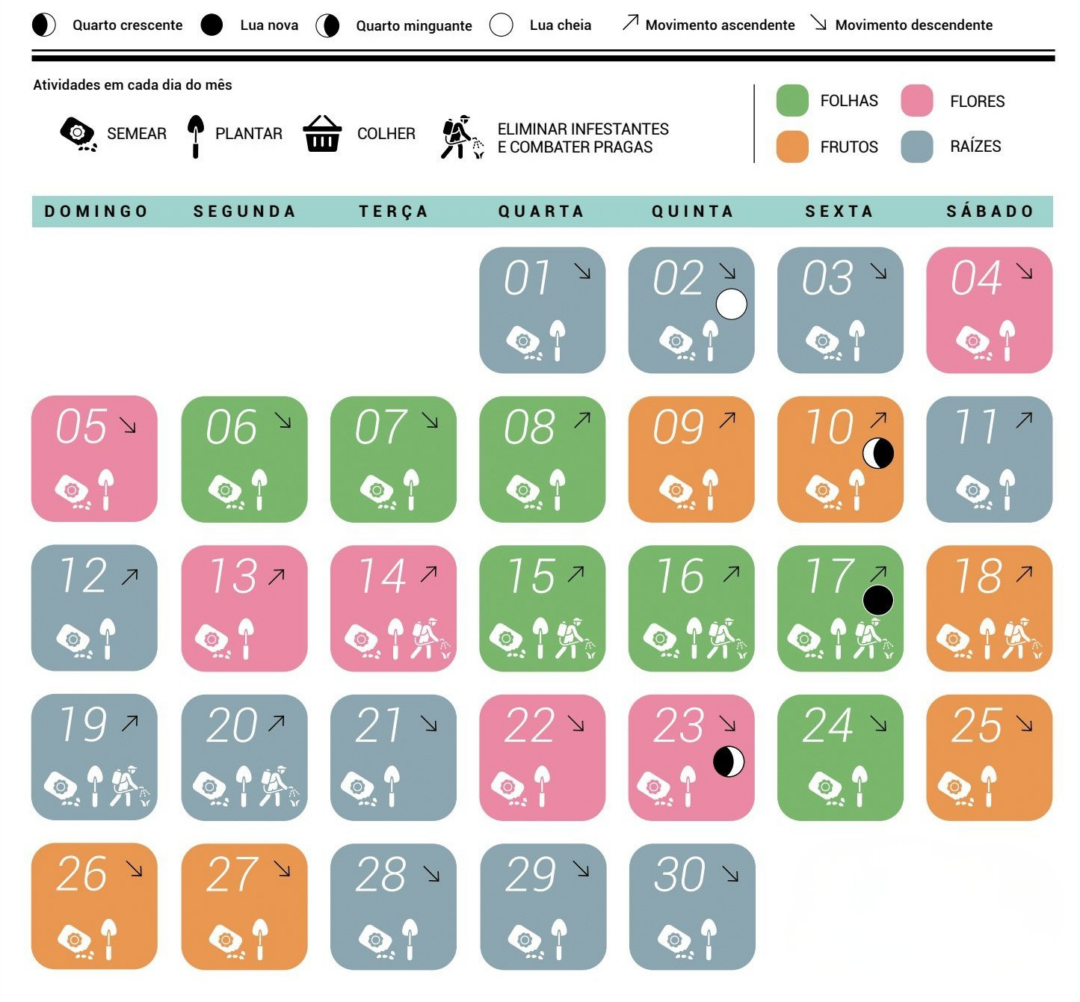 Dias flor: 4, 5, 13, 14, 22, 23 Dias fruto: 9, 10, 18, 25 a 27  Dias folha: 6 a 8, 15 a 17, 24  Dias raiz: 1 a 3, 11, 12, 19 a 21, 28 a 30.