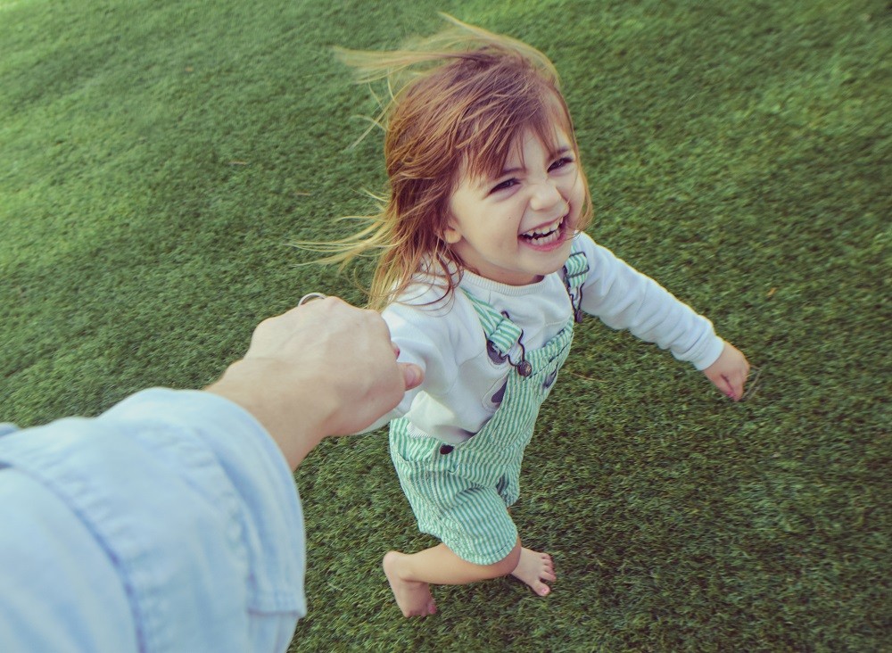 Silly little girl holding a parents hand barefoot in the grass, laughing