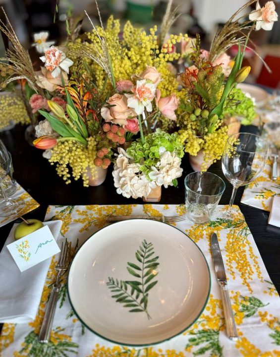 No centro da mesa, iniciei o arranjo com uma quantidade abundante de mimosas e, ao redor, formando uma coroa imaginária, fui dispondo vasinhos com água para ir colocando as outras flores que fui buscar à Rita, da Florista do Mercado. Estava tudo tão fresco e com tanta beleza! Alternei mais hortênsias, túlipas, rosas, ranúnculos, umas “bolinhas” da espécies das próteas, com uma cor alaranjada que me encantou, uns narcisos e rematei com os restantes capins e alguns verdes que tinha em mãos. Ficou lindo!