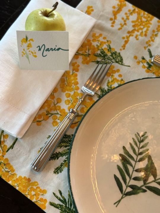 Peguei nuns individuais com motivos de mimosas, uns pratos com folhagens estampadas nos mesmos e, mais uma vez, usei a minha caixinha de aguarelas para fazer os marcadores de lugar. Uma dica muito fácil é pintar apenas um ramo e bolinhas por cima: num piscar de olhos, fica pronto um raminho de mimosa. Os meus convidados adoraram.