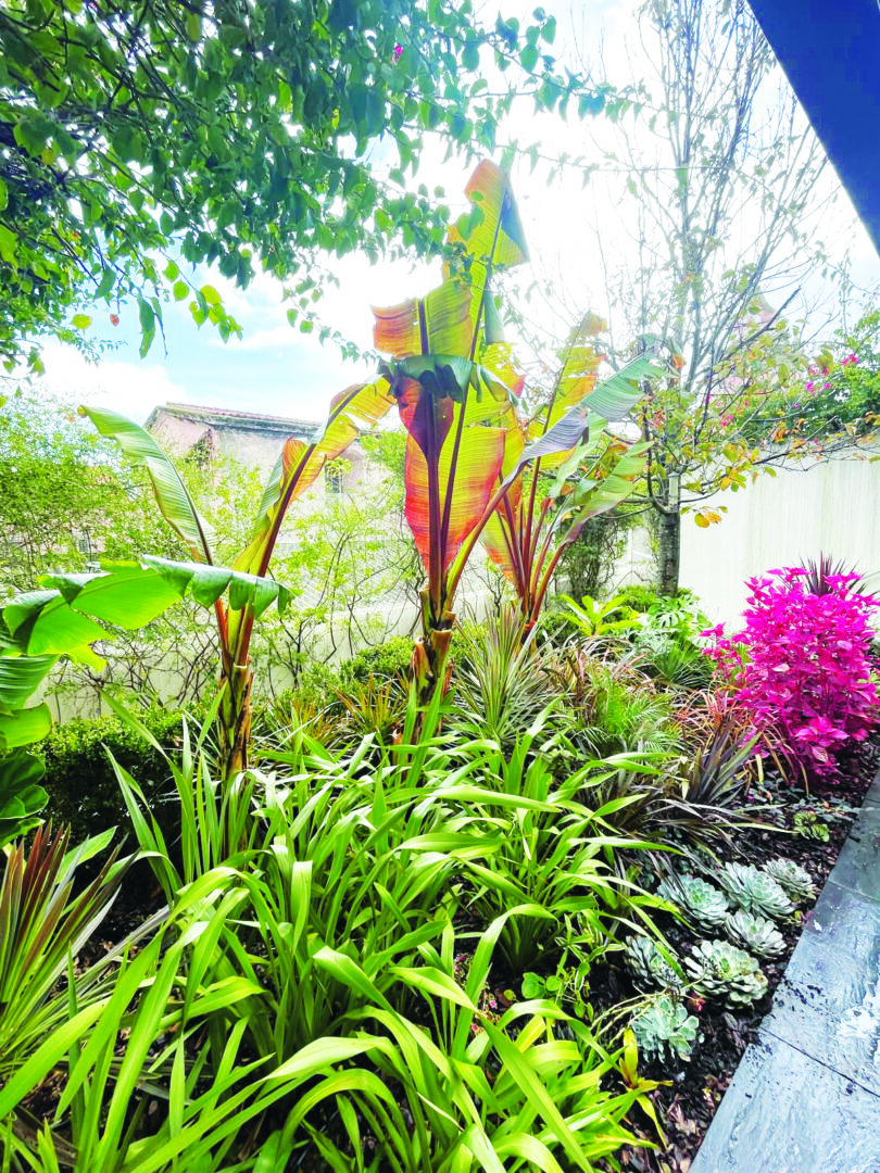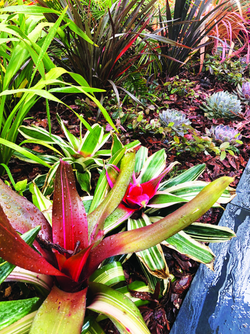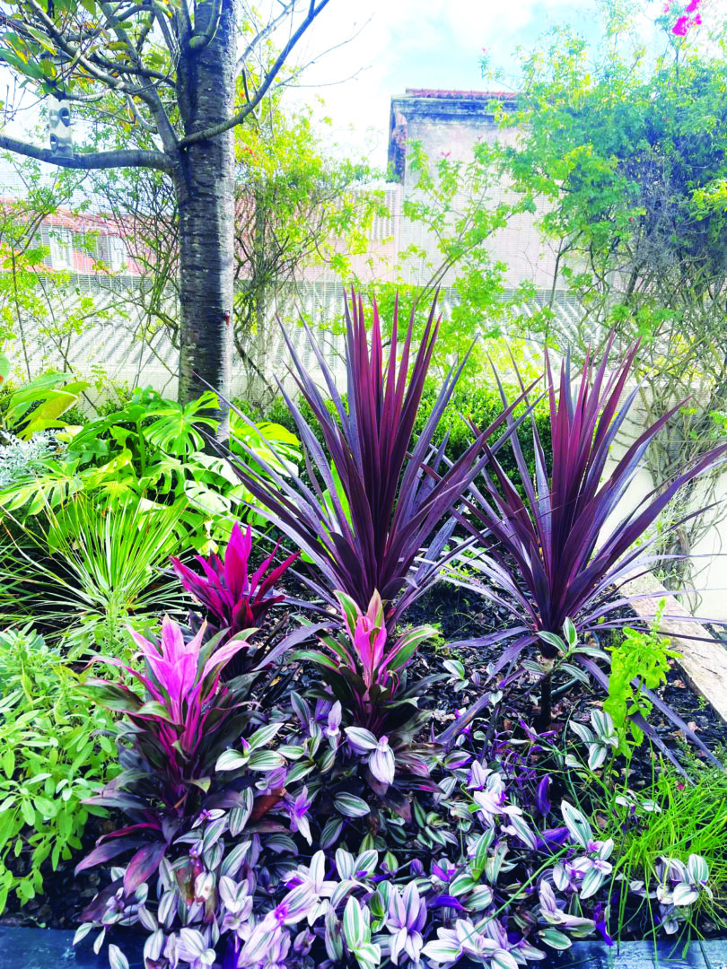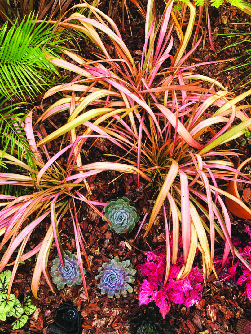 Monstera deliciosa | Plumeria rubra | Cordyline australis cv. ‘Chocolate Mint’ | Cordyline australis cv. ‘Burgandy’ | Phormium tenax | Phormium tenax cv. ‘Purpureum’ | Loropetalum chinensis | Begonia rex cv. ‘Pink’ | Echeveria cuspidata var. zaragozae cv. ‘Pink’ | Neoregelia carolinae cv. ‘Fancy’ | Phoenix roebelenii | Agave potatorum cv. ‘Kichiokan’ | Dracaena marginata | Heliconia rostrata | Ravenala madagascariesis | Philodendrone rubescens | Cordyline fruticosa cv. ‘Mambo’ | Cordyline fruticosa cv. ‘Tango’ | Cordyline fruticosa cv. ‘Rumba’ | Salvia officinalis | Yucca rostrata | Tradescantia cerinthoides cv. ‘Pink Furry’ | Jacobaea maritima syn. Senecio cineraria | Iresine diffusa f. herbstii cv. ‘Brilliantissima’ | Ensete vetricosum cv. ‘Maurelii