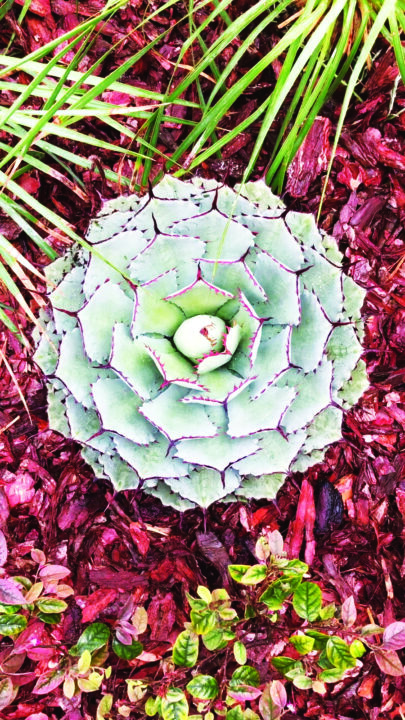 O cinzento da Yucca rostrata, Jacobaea maritima syn. Senecio cineraria e da Salvia officinalis funcionam como condutores entre manchas cromáticas e para mudar o foco. Introduzi movimento usando a ilusão ótica das formas circulares que o grupo de suculentas provoca, enquanto a sua cor de céu nublado de inverno resulta eficazmente, pois renova o balanço entre os rosados e os laivos entusiastas de laranja dos vários cultivares de Phormium tenax. Neste projeto abordei muito os laivos cromáticos que as novas propostas da lista de cultivares que se apresentam no mercado permitem pintar a paisagem. Essa interpretação no paisagismo pode levar à criação de efeitos muito abstratos quando todo o cenário de paisagem do jardim é apreciado à distância, mantendo, por outro lado, o momento empático de admirar até o humor das espécies, como sempre induz a Neoregelia carolinae cv. ‘Fancy’, as formas, feitios e padrões que nos levam a descobrir plantas desconhecidas ou a acrescentar, numa conversa invariavelmente agradável, algo de que gostamos de partilhar sobre um exemplar encontrado na composição do canteiro.