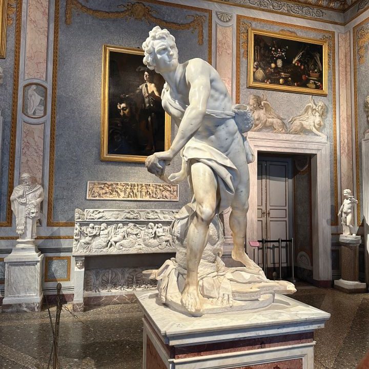 As esculturas de Bernini são absolutamente fascinantes e mudaram a forma como se fazia escultura. Pudemos ver peças como o Rapto de Prosérpina, David com a cabeça de Golias, ou a escultura Apolo e Dafne, em que ela está a transformar-se em árvore. Uma das peças centrais é a escultura de Paolina Borghese deitada numa cama, feita por António Canova.
