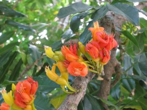 As flores têm cálices alaranjados e as corolas evoluem do amarelo até ao vermelho. Segue-se o desenvolvimento das vagens, que ficam maduras e libertam uma a quatro sementes no outono.
